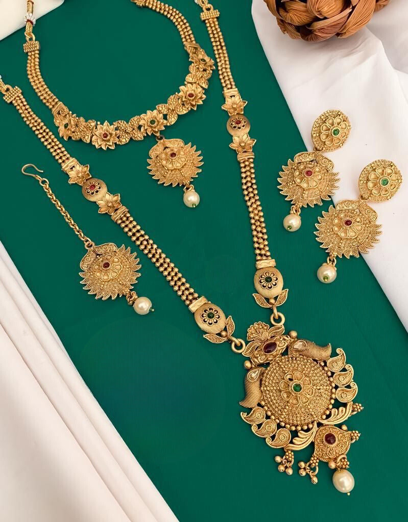 Fancy Gold Plated Rajwadi Combo Set With Mang Tikka